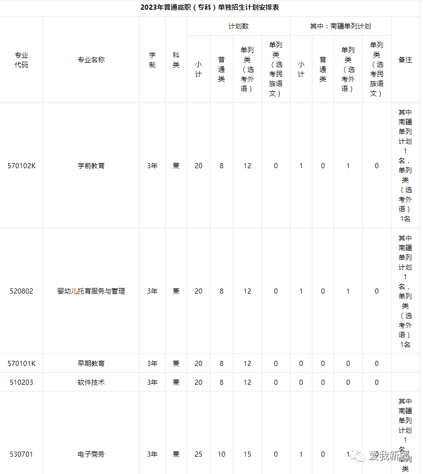 2023年我院单独招生计划350人,其中:普通类142人,单列类208人,其中南疆单列计划12人。分专业招生计划如下表: